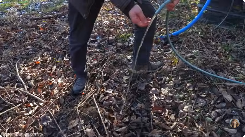 For water, he gathers groundwater into an underground pipe and stores it in a cistern halfway down the hill.