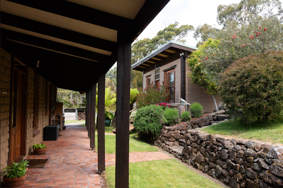 Constructed using a post-and-beam method, the structure features stringybark posts cut from a single Tasmanian tree, paired with hand-shaped salvaged wharf timbers. Mud bricks were made on-site from the property’s own earth, making it thermally efficient.