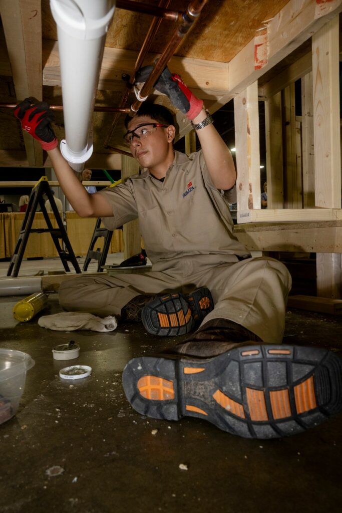 Joseph, lying under the house, installed the waterline, and kept track of the time with a watch he’d bought at Walmart just for the competition. By 1 p.m., the team’s to-do list was long and the time short — the window awning had no shingles, the wall no siding, and there were only three hours left.