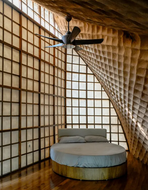 Two bedrooms flank the eastern end of the hallway on the upper level. On the floor below, two larger bedrooms are at opposite ends of the bridge. Floating wooden steps provide access to them from the corners of the living space. Jute and bamboo screens serve as walls throughout the home.