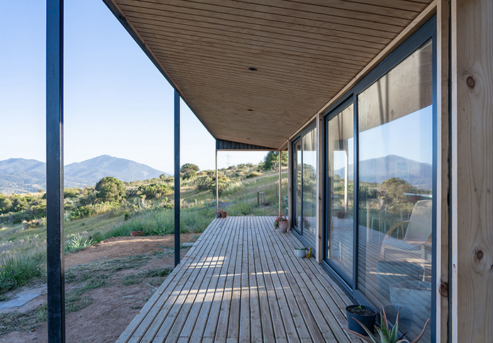 To the west, a large covered terrace runs along the facade, protected by an overhanging eave with variable height, providing shade while preserving outward views toward the Las Tupas ravine.