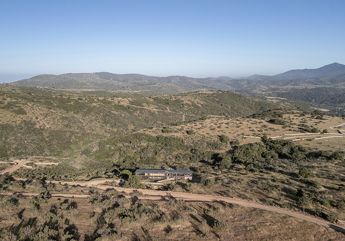 A linear skylight is incorporated along the eastern facade to introduce diffuse natural light, while carefully placed windows frame specific views of the landscape.