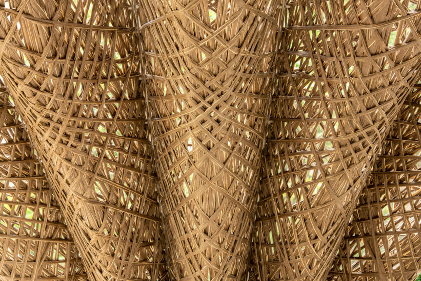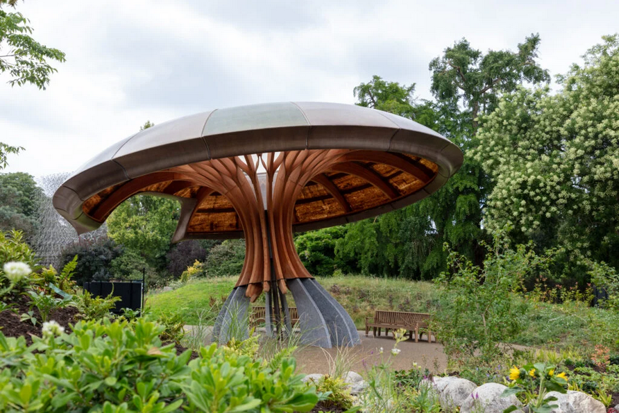The flax fibers are part of a palette of natural materials Mizzi Studio chose for the pavilion, a showcase of the essential role that plants and fungi play in tackling climate change. “It is born from the belief that our future must be grown from renewable, natural materials,” he says of the structure, which rises from a granite base, with a glulam timber trunk and frame supporting the precast panels of flax and resin. “We wanted to go beyond just choosing low carbon materials, adding those that sequester carbon and help regenerate nature.”