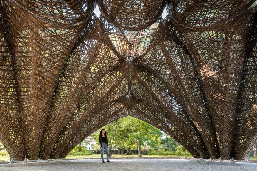 When you stand beneath Mizzi Studio’s mushroom-like pavilion at Carbon Garden in London on a sunny day, light filters through the flax and resin cap of this mysterious “fruiting body,” as founder Jonathan Mizzi describes it. “The material has this lovely translucent quality,” he says. “When you stand under it, you become held in this subsurface scattering of light.”