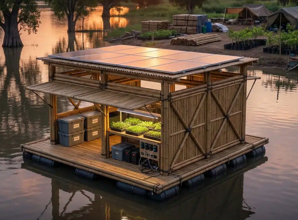 A floating bamboo shelter concept originally introduced semi-permanent microhomes for crews in flood-prone zones. Units sit on buoyant platforms while utilising rooftop solar for energy. When access roads disappear under flood pulses, boats become the corridor. A floating basecamp that can be repositioned along waterways works like a mobile operations node, not a static cabin.