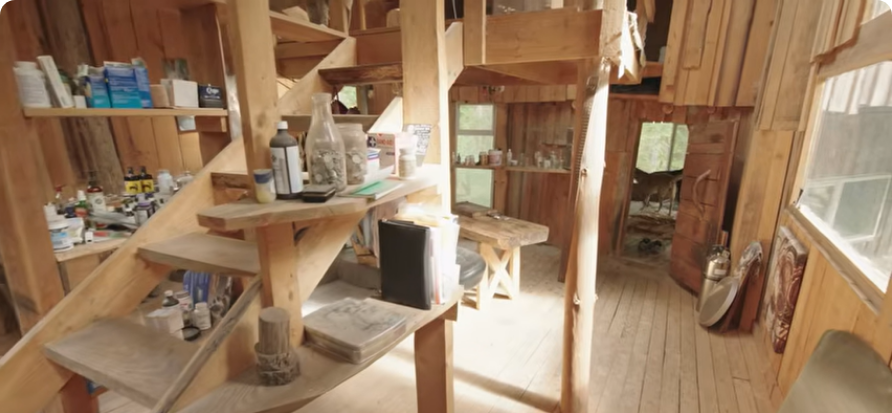 He has built 9 experimental buildings on his 20-acre property using local and natural materials like wood, stone and cob, including: a cabin for himself, utility buildings for his solar power systems, a sauna and dormitory.