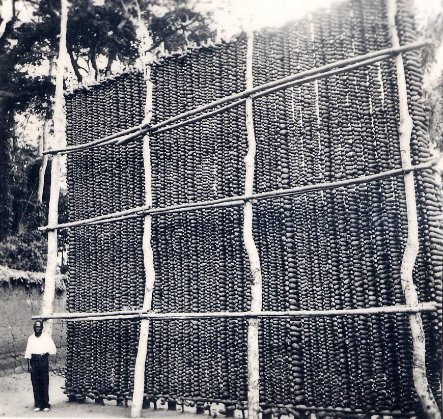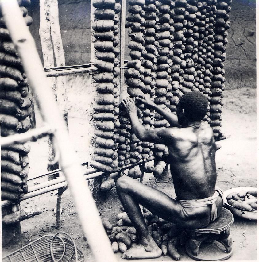 Where grains are seeds that can yield new cereal crops, yams grow from seed yams: tubers that propagate new yams that are close to the original cultivar lineage. Among the Igbo people of present-day Nigeria and neighboring countries, there is a strong relationship between the health of the land for yam cultivation, nobility, rank, and wealth. When the yam crop is first harvested, the tubers must be cured for a period of days up to several weeks. After curing, they are traditionally tied with natural fiber twine or rope around their equator in vertical chains to wooden stick frames. This keeps them away from vermin and dampness at ground-level; facilitates regular inspection of individual tubers to remove any overripe, infected, or otherwise undesirable ones; and visually demonstrates a family’s bio-material wealth—an insurance policy for survival from one season to the next.