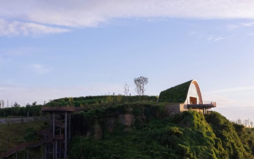 The Platform Hill pavilion, completed between 2022 and 2025, sits among the hills south of Chengdu and functions as a visitor destination and event space that capitalizes on scenic panoramas.