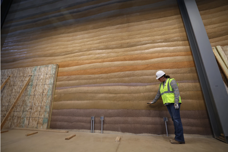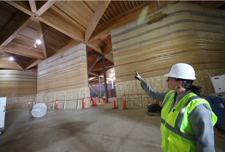 As the exterior of the library nears completion the architect’s visionary concept is coming to life, highlighted by a towering rammed-earth wall, which reaches 30 feet in the air toward a sprawling ceiling of exposed timber panels and beams, and stretches 240 feet across. Bearing a resemblance to the sedimentary striations of North Dakota’s Badlands, its rough-hewn surface is pocked and porous, with uneven layers, and an earthy palate of sand, stone, mud and dust.