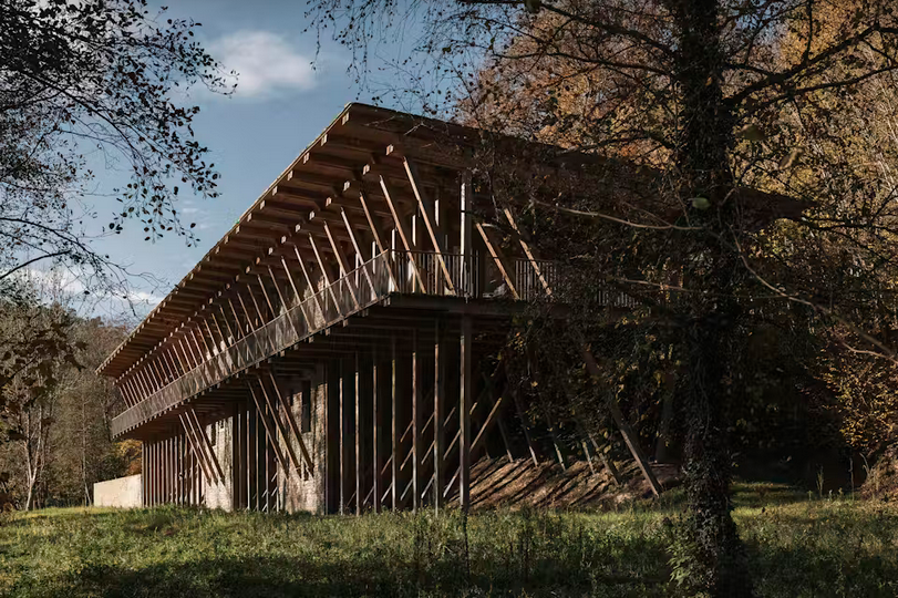 “Built entirely from local stone, timber, and earth, it follows the vernacular techniques of the region while redefining them through experimentation and shared knowledge.”