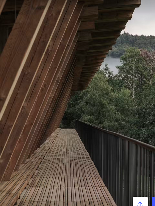 “The main house, a timber-framed structure made of untreated local Douglas fir, features a fully glazed living area on its upper floor, offering 360-degree views of the surrounding landscape while leaning gently against the forested hillside. Its operable façade embodies climate-adaptive architecture, seamlessly integrating living spaces with nature.”