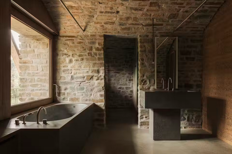 “The natural stone volumes, laid in lime mortar and insulated with hemp, house the technical and intimate spaces of the dwelling.”